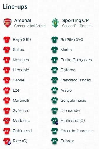 阿森纳首发:1-戴维-拉亚、2-萨利巴、3-克里斯蒂安-莫斯克拉、5-因卡皮耶、6-加布里埃尔、10-埃泽、11-马丁内利、14-哲凯赖什、20-马杜埃凯、36-马丁-苏比门迪、41-赖斯
