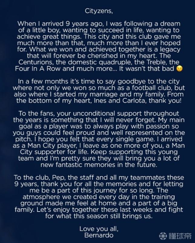 城迷们,你们多年以来的无条件支持我永不会遗忘。作为一名球员,我的目标始终是充满激情地去迎接比赛,让你们能因我们感到自豪,并认为我们是代表你们而战,我希望任何一场比赛你们都能感受到这一点。我来时是曼城球员,走时是曼城的终身信徒,请继续支持这支年轻的球队,我坚信他们未来会给你们带来更多美妙的时刻!